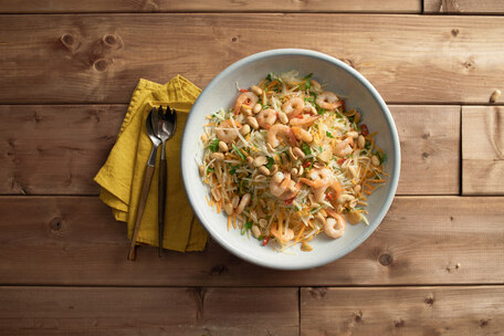 Avant de servir, saupoudrer la salade de cacahuètes hachées et garnir avec des tranches de citron vert et de coriandre.